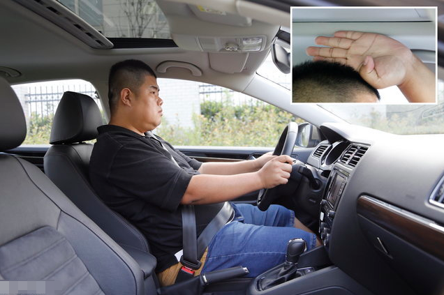同一位体验者坐入速腾的前排,坐姿一致的情况下,头部空间为4指。