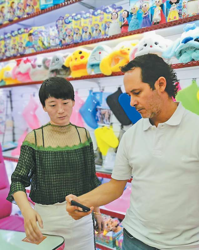 近日,市场经营户向外商推介玩具产品。