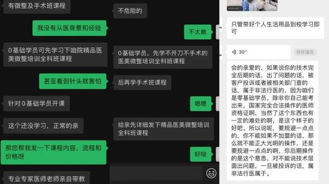 随后深燃按照提示添加了客服人员,微信名为某微整学院王老师,深燃一再强调自己“没有医学背景,甚至看到针头都害怕”,但对方表示:“学院的医美微整培训全科班就是针对0基础学员的,包教包会、签约教学,后期可终身免费复训。0基础学员先学不开刀不手术的微整形课程,后续可以再学手术班课程。”