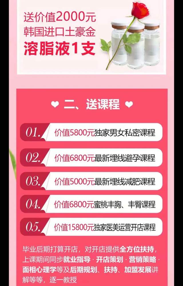王老师还补充,具体如何规避风险,老师在课堂上会讲到,比如有些产品不能放在明面上,有些连柜子里都不能放。她自己也承认,如果技术出了问题,被客户投诉或被相关部门查到的话,属于非法行医,所以操作的时候,要手法不要出问题,另外好确认客户是熟悉靠谱的,不熟悉的人尽量不要做。为了取得客户信任,王老师提醒,除了证书,跟院长的合照、毕业照等都可以拿给客户看。
