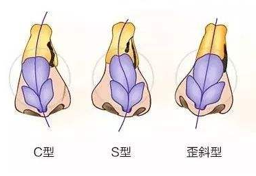 (1)歪斜型:又称单纯性歪鼻,多为鼻软骨部即鼻下部偏斜,也可伴有轻度鼻骨偏斜,特点是鼻梁中、下部偏向中轴线一侧,以鼻尖点离中轴线远,多为先天性或幼年时期外伤所致。