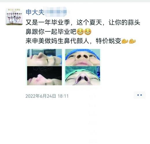 半个月后,大学生毕业季。“又是一年毕业季,这个夏天,让你的蒜头鼻跟你一起毕业吧。来申美做妈生鼻代颜人,特价蜕变。”6月24日,长沙火车站附近的申美医疗美容医院“吹响”大学生毕业整形季的“号角”。