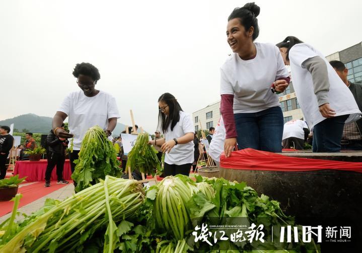 参加比赛的选手不仅有经验丰富的本地大妈大伯,也有城市白领,还有外国留学生,一些小朋友也在父母协助下参与体验。只见选手们三人一组,一人站在石缸里用脚猛踩,另外两人负责加盐和雪菜。“可以加盐了,可以加盐了。”选手也就凑个热闹,腌制的关键技术,都是一旁的老师傅在指导。