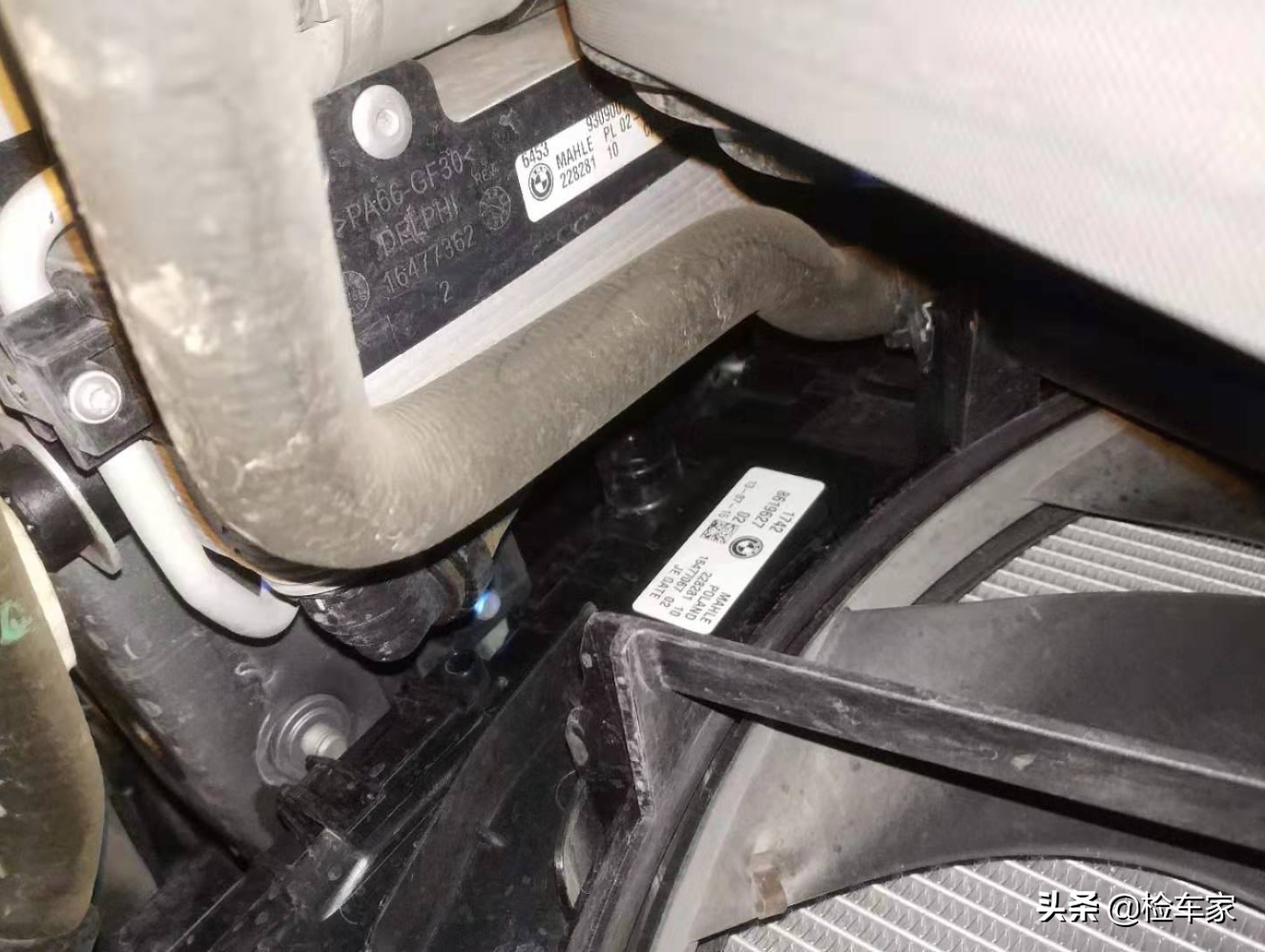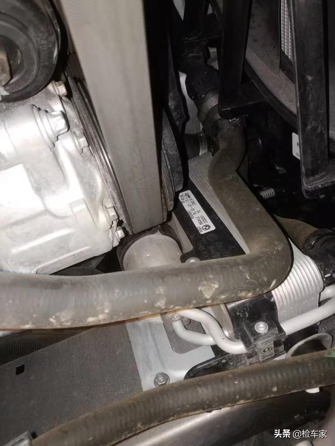 前部水箱、电子扇、散热器还有线束等部件生产日期都与车辆出厂日期相符,也没有拆卸维修的痕迹。重点检查了一下前部,防撞梁没有拆卸痕迹,看来前部不是什么大事故。不过检测内饰的时候还是要仔细检查一下气囊,防止这次事故触发气囊传感器。