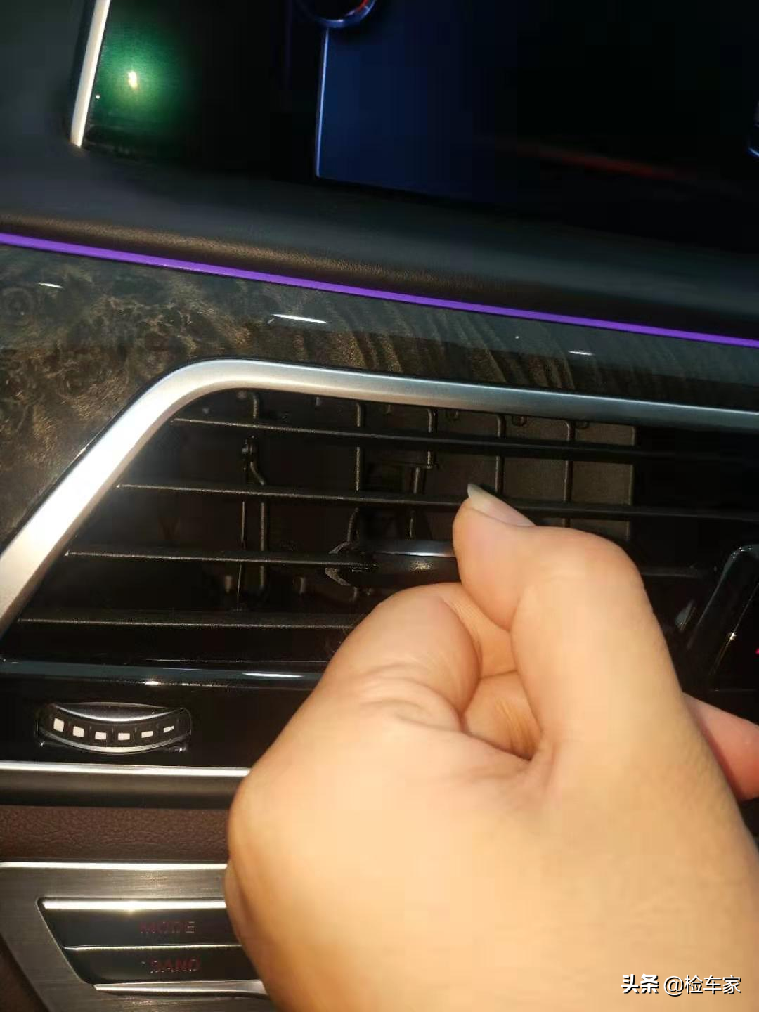 中央左侧空调出风口的拨片脱落了,仔细观察后发现是拨片联动装置脱落了,装回即可,小问题!