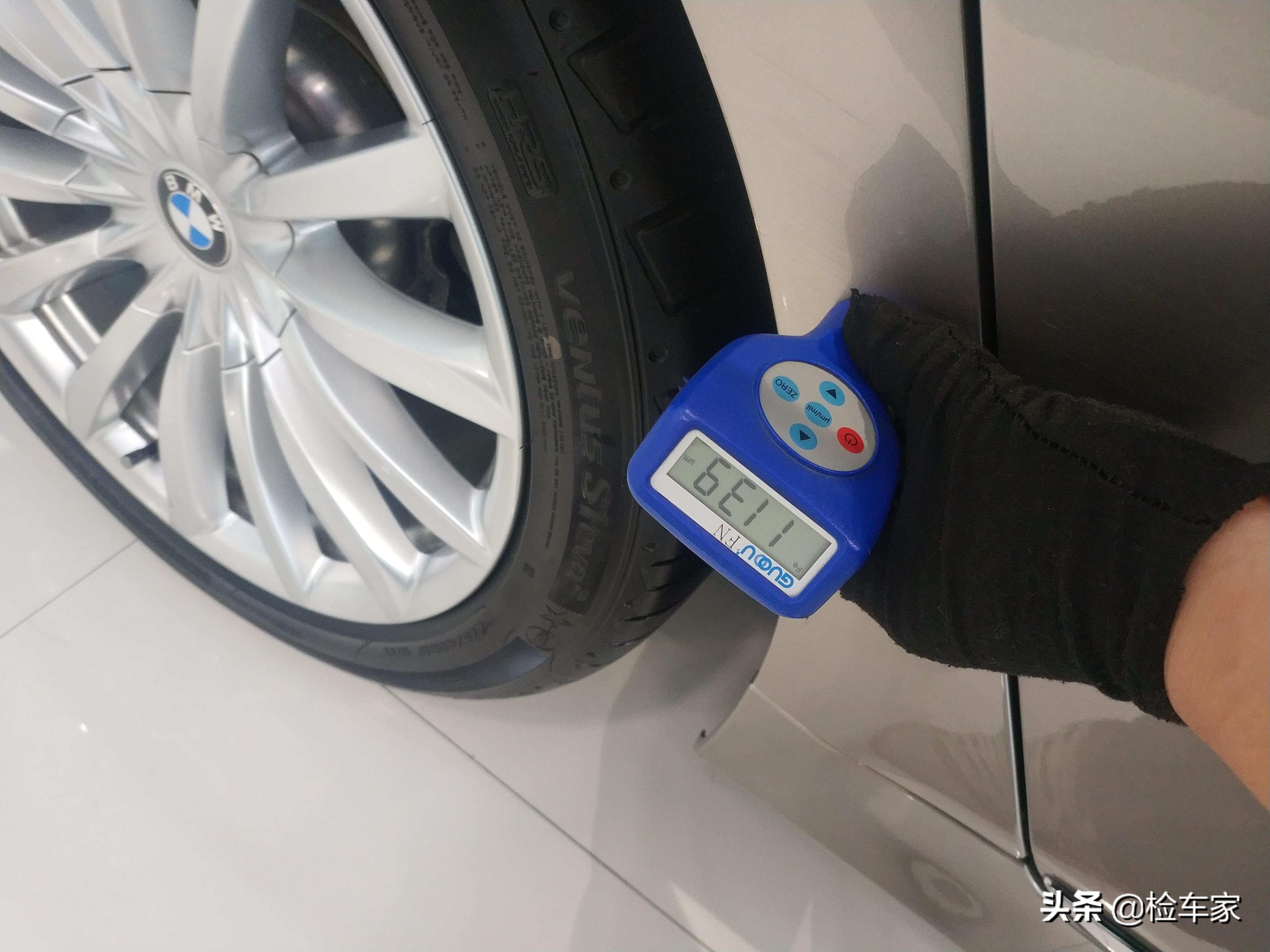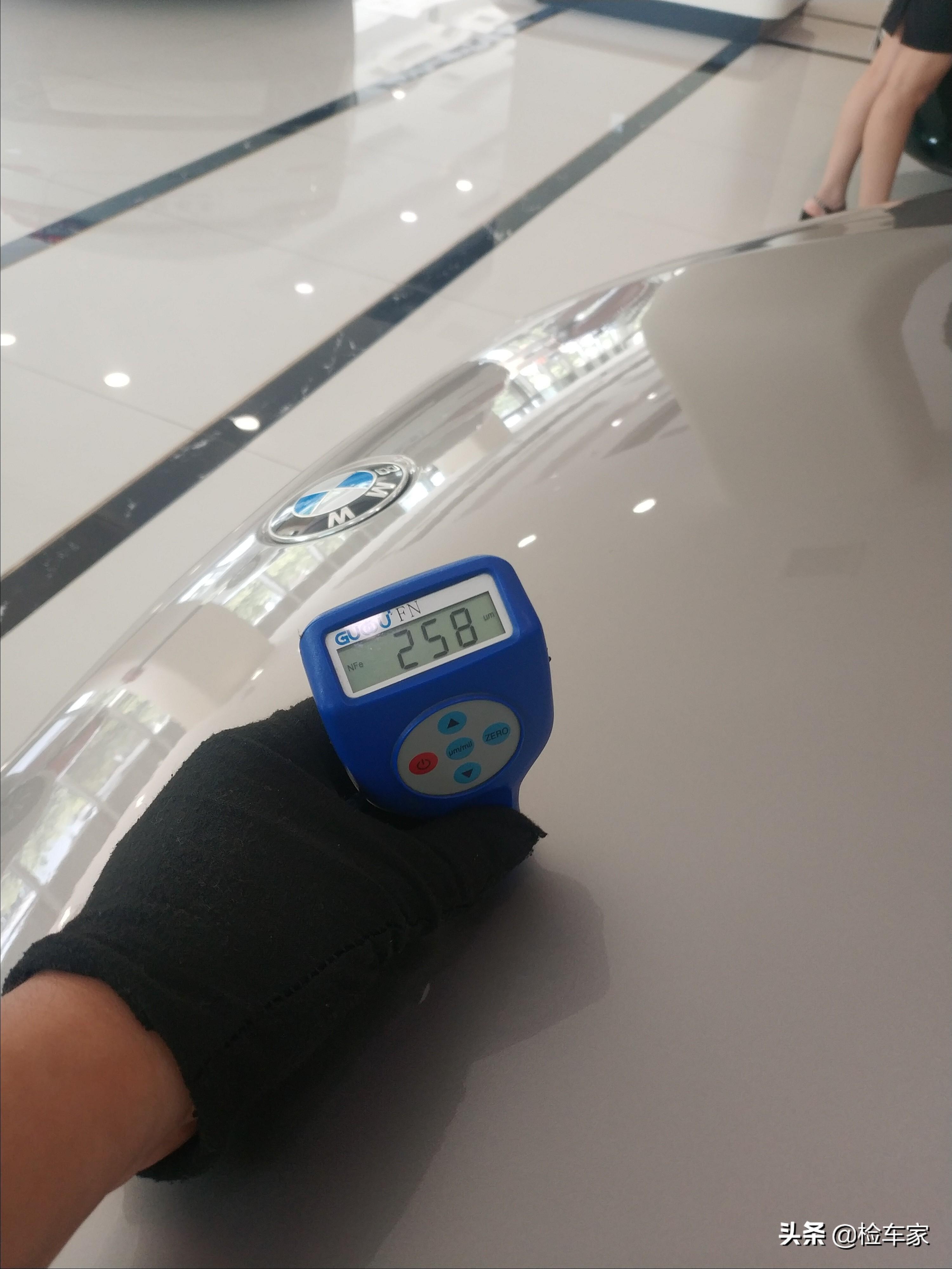 拿出工具检查车身金属漆面,宝马的正常漆面数值在120-130的样子,机盖漆面数值258,说明有喷漆修复.跟前面右前翼子板的碰撞有没有关系呢?陈老师暂时也不知道,得接着检查才能确认。