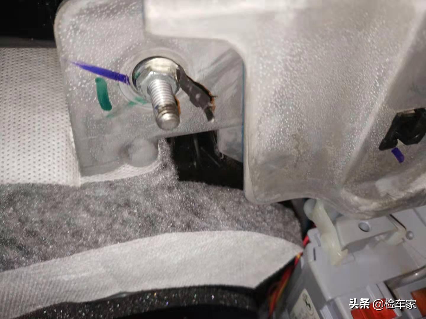 水箱上盖板的塑料卡子有撬动拆卸的痕迹,随即观察内测发现水箱框架上横梁拆卸,左右加强拉杆拆卸,如果是事故原因拆卸的话,前大灯肯定是保不住了。
