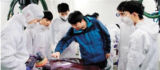 汽车整形涂装系系主任王俊把汽车喷漆比作给女性化妆。“这是很细的功夫,很需要花时间来做。难就难在手不能抖,得有一双很稳的手。”他说,一辆车看起来就外面一层颜色,但其实里面有很多层,仅外面这层金属漆也有很多光泽度上的细微变化。