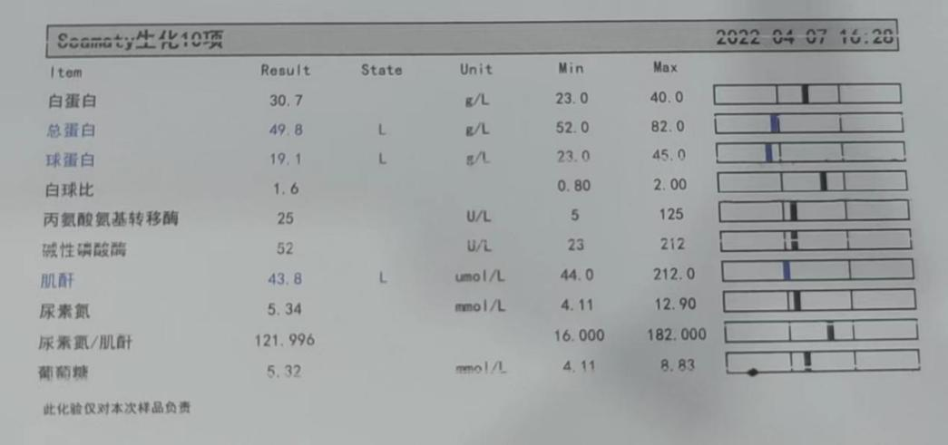 ●生化结果异常指标可能和饥饿,蛋白丢失性肠道疾病有关。