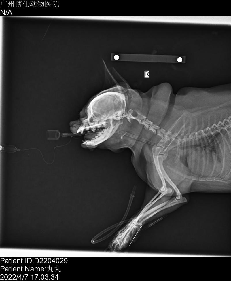 该犬呼吸稳定进行喉部X光片拍摄,可见喉部骨骼结果正常,气管未见异常,肥胖导致皮肤褶皱。