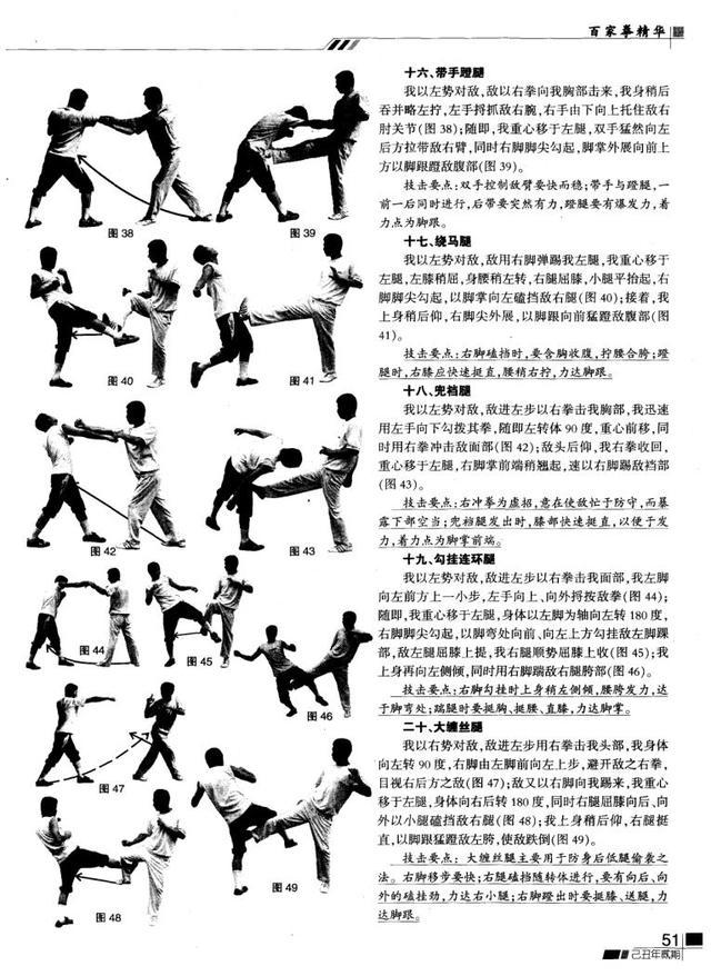 十六、带手蹬腿 我以左势对敌,敌以右拳向我胸部击来,我身稍后吞并略左拧,左手捋抓敌右腕,右手由下向上托住敌右肘关节(图38);随即,我重心移于左腿,双手猛然向左后方拉带敌右臂,同时右脚脚尖勾起,脚掌外展向前上方以脚跟蹬敌腹部(图39)。 技击要点:双手控制敌臂要快而稳;带手与蹬腿,一前一后同时进行,后带要突然有力,蹬腿要有爆发力,着力点为脚跟。 十七、绕马腿 我以左势对敌,敌用右脚弹踢我左腿,我重心移于左腿,左膝稍屈,身腰稍左转,右腿屈膝,小腿平抬起,右脚脚尖勾起,以脚掌向左磕挡敌右腿(图40);接着,我上身稍后仰,右脚尖外展,以脚跟向前猛蹬敌腹部(图41)。 技击要点:右脚磕挡时,要含胸收腹,拧腰合胯;蹬腿时,右膝应快速挺直,腰稍右拧,力达脚跟。 十八、兜裆腿 我以左势对敌,敌进左步以右拳击我胸部,我迅速用左手向下勾拨其拳,随即左转体90度,重心前移,同时用右拳冲击敌面部(图42);敌头后仰,我右拳收回,重心移于左腿,右脚掌前端稍翘起,速以右脚踢敌裆部(图43)。 技击要点:右冲拳为虚招,意在使敌忙于防守,而暴露下部空当;兜裆腿发出时,膝部快速挺直,以便于发力,着力点为脚掌前端。 十九、勾挂连环腿 我以左势对敌,敌进左步以右拳击我面部,我左脚向左前方上一小步,左手向上、向外捋按敌拳(图44);随即,我重心移于左腿,身体以左脚为轴向左转180度,右脚脚尖勾起,以脚弯处向前、向左上方勾挂敌左脚踝部,敌左腿屈膝上提,我右腿顺势屈膝上收(图45);我上身再向左侧倾,同时用右脚踹敌右腿胯部(图46)。 技击要点:右脚勾挂时上身稍左侧倾,腰胯发力,达于脚弯处;踹腿时要挺胸、挺腰、直膝,力达脚掌。 二十、大缠丝腿 我以右势对敌,敌进左步用右拳击我头部,我身体向左转90度,右脚由左脚前向左上步,避开敌之右拳,目视右后方之敌(图47);敌又以右脚向我踢来,我重心移于左腿,身体向右后转180度,同时右腿屈膝向后、向外以小腿磕挡敌右腿(图48);我上身稍后仰,右腿挺直,以脚跟猛蹬敌左胯,使敌跌倒(图49)。 技击要点:大缠丝腿主要用于防身后低腿偷袭之法。右脚移上海步要快;右脚磕挡随转体进行,要有向后、向外的磕挂劲,力达右小腿;右脚蹬出时要挻膝、送腿,力达脚跟。