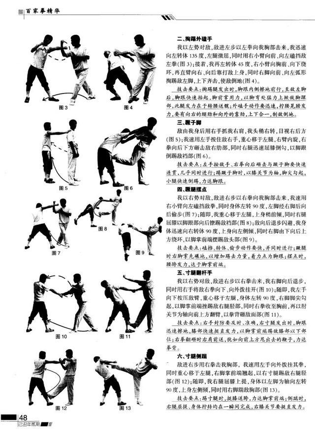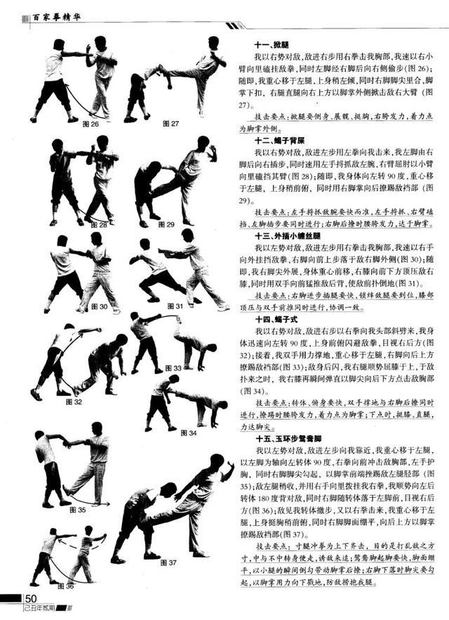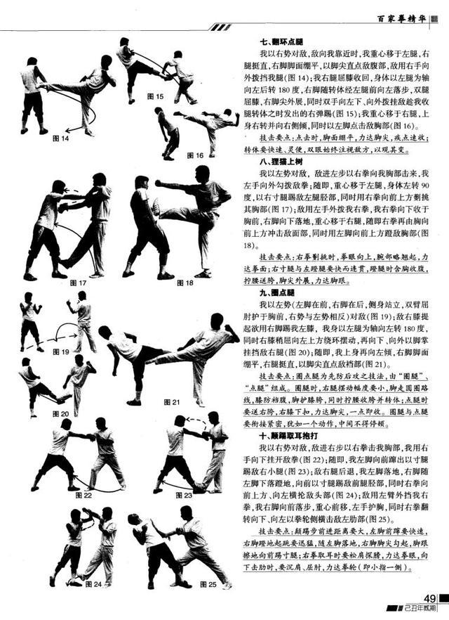 六、寸腿侧踹 敌进右步用右拳击我胸部,我速用左手向外拨挂其拳。同时重心移于左腿,右脚掌前端翘起,以右寸腿踢敌右腿胫部(图12);随即,我右腿屈膝上提,身体以左脚为轴向左转90度,上身左侧倾,同时用右脚踹敌胸部(图13)。 技击要点:踢寸腿时,挺膝送胯,力达脚掌前端,侧踹时,右腿屈提、身体拧转均在一瞬间完成,右膝关节要挺直发力。 七、翻环点腿 我以右势对敌,敌向我靠近时,我重心移于左腿,右腿挺直,右脚脚面绷平,以脚尖直点敌腹部,敌用右手向外拨挡我腿(图14);我右腿屈膝收回,身体以左腿为轴向左后转180度,右脚随转体经左腿前向左落步,双腿屈膝,右脚尖外展,同时双手向左下、向外拨挂敌趁我收腿转体之时发出的右弹踢(图15);我重心移于右腿,上身右转并向右侧倾,同时以左脚点击敌胸部(图16)。 技击要点:点击时,脚面绷平,力达脚尖,疾点速收;转体要快速、灵便,双眼始终注视敌方,以观其变。 八、狸猫上树 我以左势对敌,敌进左步以右拳向我胸部击来,我左手向外勾拨敌拳;随即,重心移于左腿,身体左转90度,以右寸腿踢敌左腿胫部,同时用右拳向前上方劐挑其胸部(图17);敌用左手外拨我右拳,我右拳向下收于胸前,右脚向下落地,重心移于右腿,随即右拳再由胸向前上方冲击敌面部,同时用左脚向前上方蹬敌胸部(图18)。 技击要点:右拳劐挑时,拳眼向上,腕部略翘起,力达拳面;右寸腿与左蹬腿要快而连贯,蹬腿时含胸收腹,拧腰送胯,脚尖外展,力达脚跟。 九、圈点腿 我以左势(左脚在前,右脚在后,侧身站立,双臂屈肘护于胸前,右势与左势相反)对敌(图19);敌右膝提起欲用右脚踢我左膝,我身以左腿为轴向左转180度,同时右膝稍屈向左上方绕环摆动,再向下、向外以脚掌挂挡敌右腿(图20);随即,我上身再向左倾,右脚脚面绷平,右腿挺直,以脚尖直点敌裆部(图21)。 技击要点:圈点腿为先防后攻之技法。由“圈腿”、“点腿”组成。圈腿时,右腿摆动幅度要小,脚走圆圈路线,膝防裆腹,脚护膝胯,同时拧腰收胯并转体;点腿时要送右胯,右膝下扣,力达脚尖,一点即收。圈腿与点腿要衔接紧密,犹如一个动作,中间不得停顿。 十、颠踢取耳抱打 我以右势对敌,敌进右步以右拳击我胸部,我用右手向下挂开敌拳(图22);随即,我左脚向前蹿出以寸腿踢敌右小腿(图23);敌右腿后退,我左脚落地,右脚随左脚下落蹬地,向前以寸腿踢敌前腿胫部,同时右拳向前上方、向左横抡敌头部(图24);敌用左臂外挡我右拳,我右脚向前落步,重心前移,左手护胸,同时右拳翻转向下、向左以拳轮侧横击敌左肋部(图25)。 技击要点:颠踢步前进距离要大,左脚前蹿要快速,右脚蹬地起跳要迅猛,随左脚落地,右脚脚尖勾起,脚跟擦地向前踢寸腿;右拳取耳时要松肩探膀,力达拳眼,向下击肋时,要沉肩、屈肘,力达拳轮(即小指一侧)。 十一、掀腿 我以右势对敌,敌进右步用右拳击我胸部,我速以右小臂向里磕挂敌拳,同时左脚经右脚后向右侧偷步(图26);随即,我重心移于左腿,上身稍左倾,同时右脚脚尖里合,脚掌下扣,右腿直腿向右上方以脚掌外侧掀击敌右大臂(图27)。 技击要点:掀腿要侧身、展髋、挻胸,右胯发力,着力点为脚掌外侧。 十二、蝎子背屎 我以右势对敌,敌进左步用左拳向我击来,我左脚由右脚后向右插步,同时速用左手捋抓敌左腕,右臂屈肘以小臂向里磕挡其臂(图28);随即,我身体向左转90度,重心移于左腿,上身稍前俯,同时用右脚掌向后撩踢敌裆部(图29)。