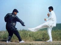 技术简析:这一组实战内容体现了戳脚“三只手”的技击特点。所谓“三只手”是指戳脚在实战中常用两只胳膊一条腿,手法由上封防、进攻,使敌忙于防上,腿法由下主攻,往往上虚下实;从进攻部位来看,为上、中、下连环套打,上打头,下踢胫,中部掀击裆。