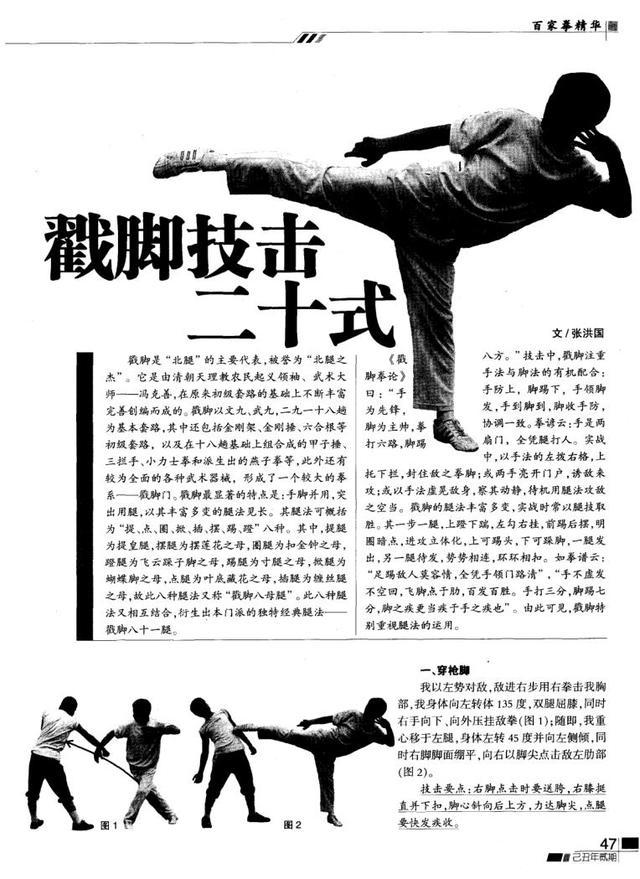 戳脚技击二十式戳脚是“北腿”的主要代表,被誉为“北腿之杰”。它是由清朝天理教农民起义、武术大师——冯克善,在原来初级套路的基础上不断丰富完善创编而成的。戳脚以文九、武九,二九一十八趟为基本套路,其中还包括金刚架、金刚捶、六合根等初级套路,以及在十八趟基础上组合成的甲子捶、三拦手、小力士拳和派生出的燕子拳等,此外还有较为的各种武术器械,形成了一个较大的拳系——戳脚门。戳脚显著的特点是:手脚并用,突出用腿,以其丰富多变的腿法见长。其腿法可概括为“提、点、圈、掀、插、摆、踢、蹬”八种。其中,提腿为提皇腿,摆腿为摆莲花之母,圈腿为扣金钟之母,蹬腿为飞云跺子脚之母,踢腿为寸腿之母,掀腿为蝴蝶脚之母,点腿为叶底藏花之母,插腿为缠丝腿之母,故此八种腿法又称“戳脚八母腿”。此八种腿法又相互结合,衍生出本门派的独特经典腿法——戳脚八十一腿。 《戳脚拳论》曰:“手为先锋。脚为主帅,拳打六路,脚踢八方。”技击中,戳脚注重手法与脚法的有机配合:手防上,脚踢下,手领脚发,手到脚到,脚收手防,协调一致。拳谚云:手是两扇门,全凭腿打人。实战中,以手法的左拔右格,上托下拦,封住敌之拳脚;或两手亮开门户,诱敌来攻;或以手法虚晃敌身,察其动静,待机用腿法攻敌之空当。戳脚的腿法丰富多变,实战时常以腿技取胜。其一步一腿,上蹬下踹,左勾右挂,前踢后摆,明圈暗点,进攻立体化,上可踢头,下可跺脚,一腿发出,另一腿待发,势势相连,环环相扣。如拳谱云:“足踢敌人莫容情,全凭手领门路清”,“手不虚发不空回,飞脚点于肋,百发百胜。手打三分,脚踢七分,脚之疾更当疾于手之疾也”。由此可见,戳脚特别重视腿法的运用。
