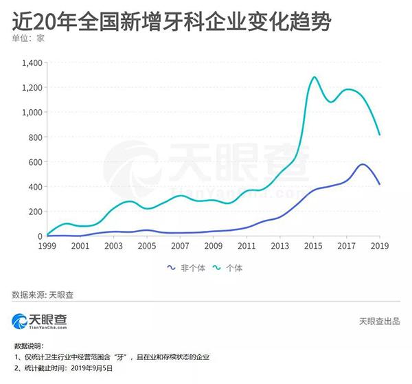 天眼查数据显示,近二十年来,我国共新增12905家牙科企业,且每年新注册的牙科企业数持续增长。2015-2019年,每年新增牙科企业均超过1000家,呈井喷式发展,其中2015年新增的牙科企业数接近2014年的两倍。