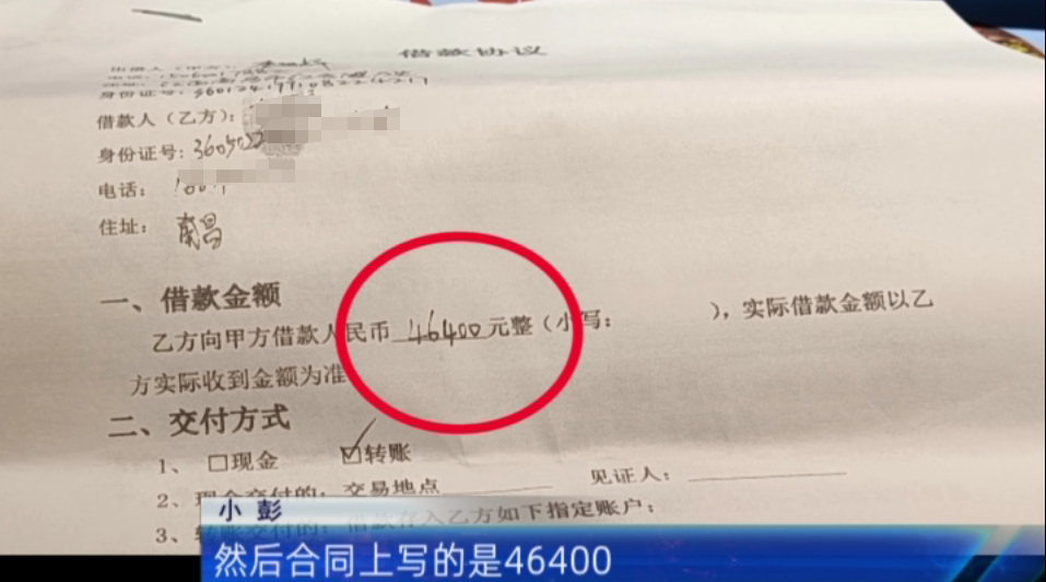 小彭:实际转给我的是44600元,但合同上写的是46400元,他跟我说算了利息,实际上加利息要还48000多元。我又被骗了,又被他骗了。