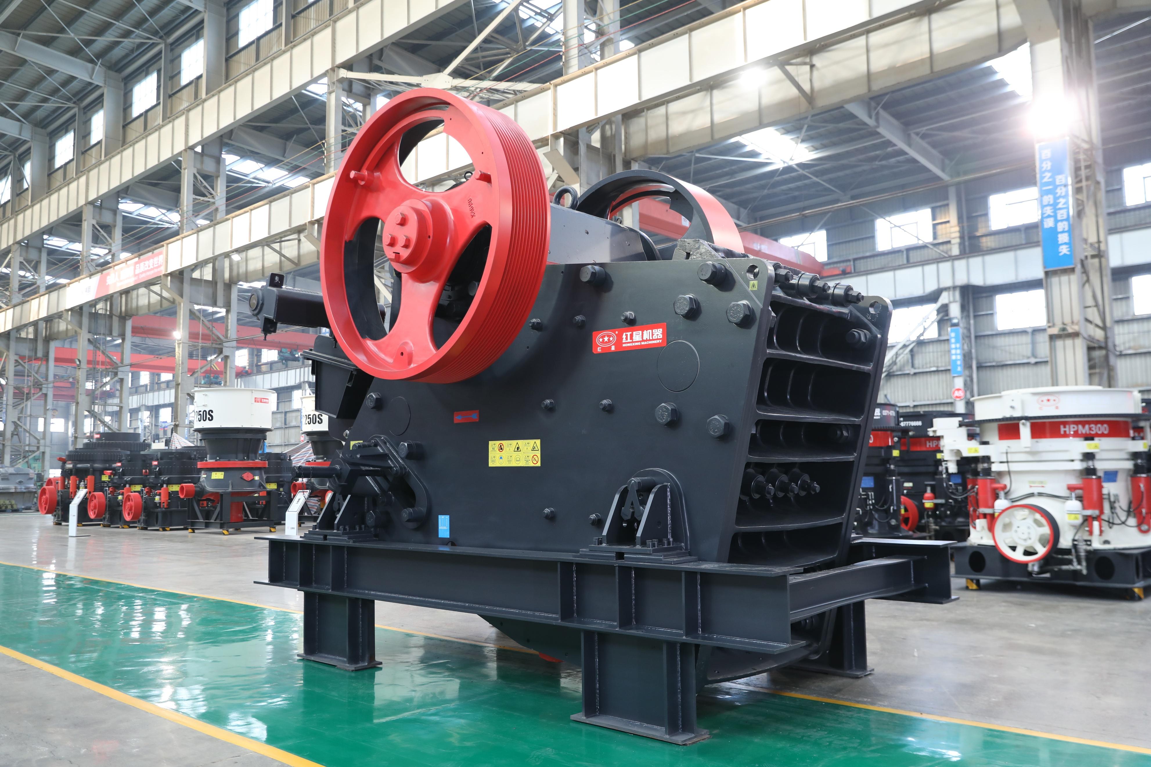 花岗岩或变质岩经过振动给料机,进入颚式破碎机进行粗级破碎,岩石被破碎成中等大小的石块。颚破具有生产率高,占用空间小、破碎比更大、运行平稳的优点。