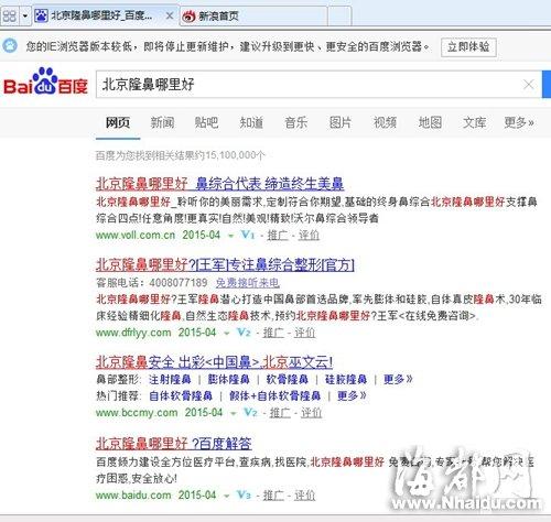搜索﹃北京隆鼻哪家好﹄,搜到的结果仍可看到﹃推广﹄字样,意味着还有医疗机构出钱竞价