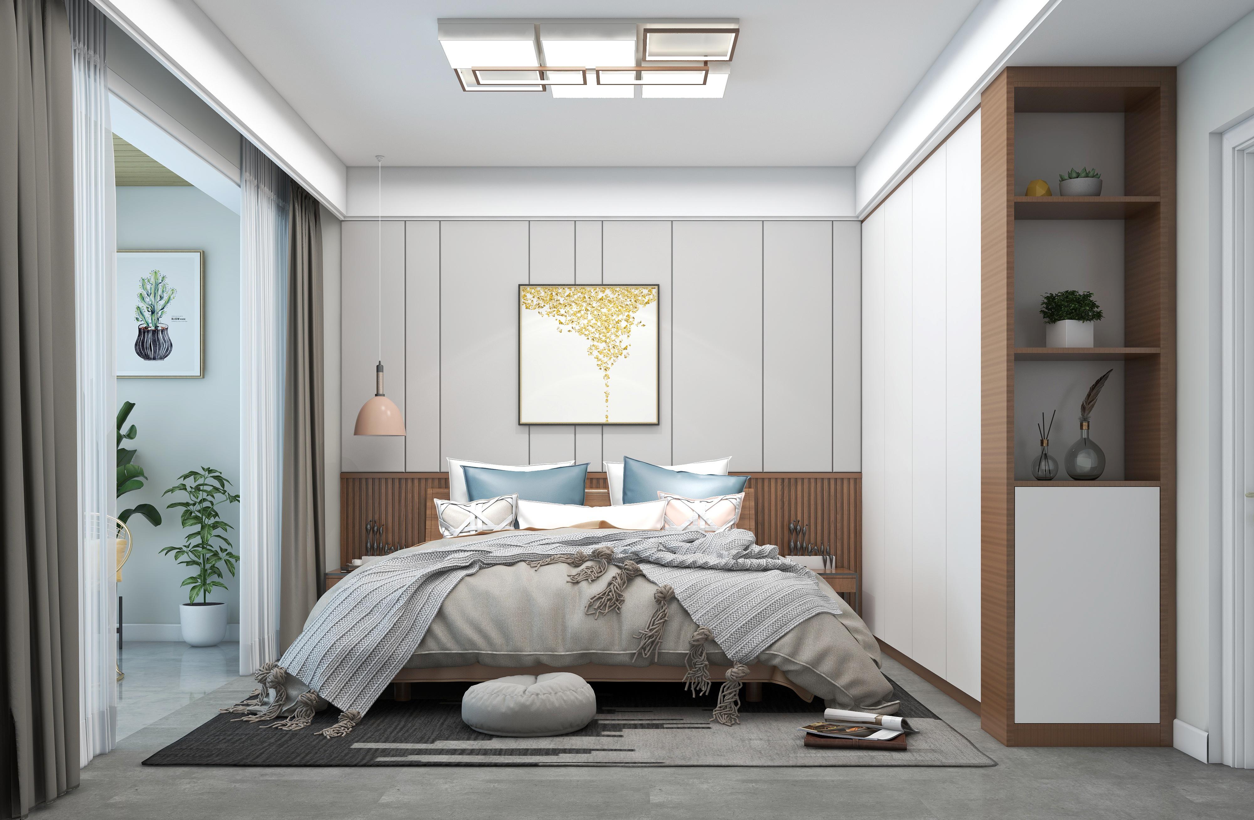 主卧室方面,把主卫生间缩小,增大衣帽间面积,增大了业主的储物空间,同时增大了整个卧室的面积。卧室背景墙用木饰面板和硬包做背景墙,使整个卧室空间色彩灵动,丰富。
