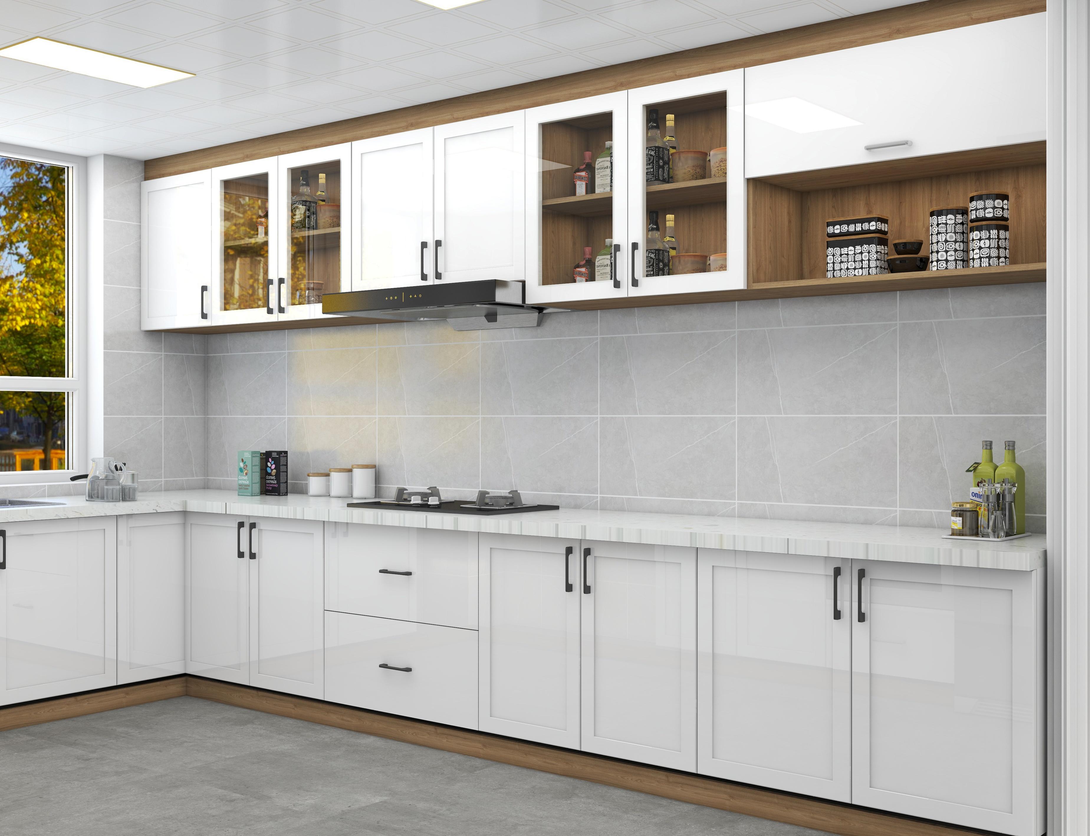 厨房选用哑光面墙砖上墙,运用了白色美缝。整个橱柜的选材上面选用简单的门板造型,吊顶做了开放格和玻璃门,把蒸箱电器做嵌入式,白色为主,整个厨房干净,大气。