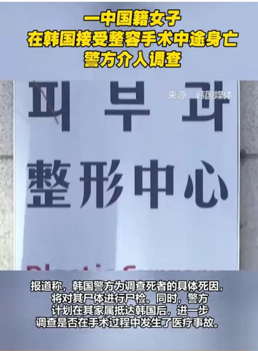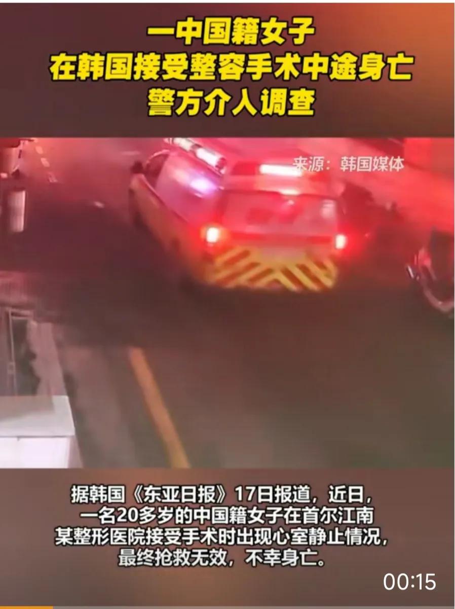 #中国女子在韩国接受整容手术时身亡#据韩国《东亚日报》17日报道,近日,一名20多岁的中国籍女子在首尔江南某整形医院接受手术时出现心室静止情况,终抢救无效,不幸身亡。