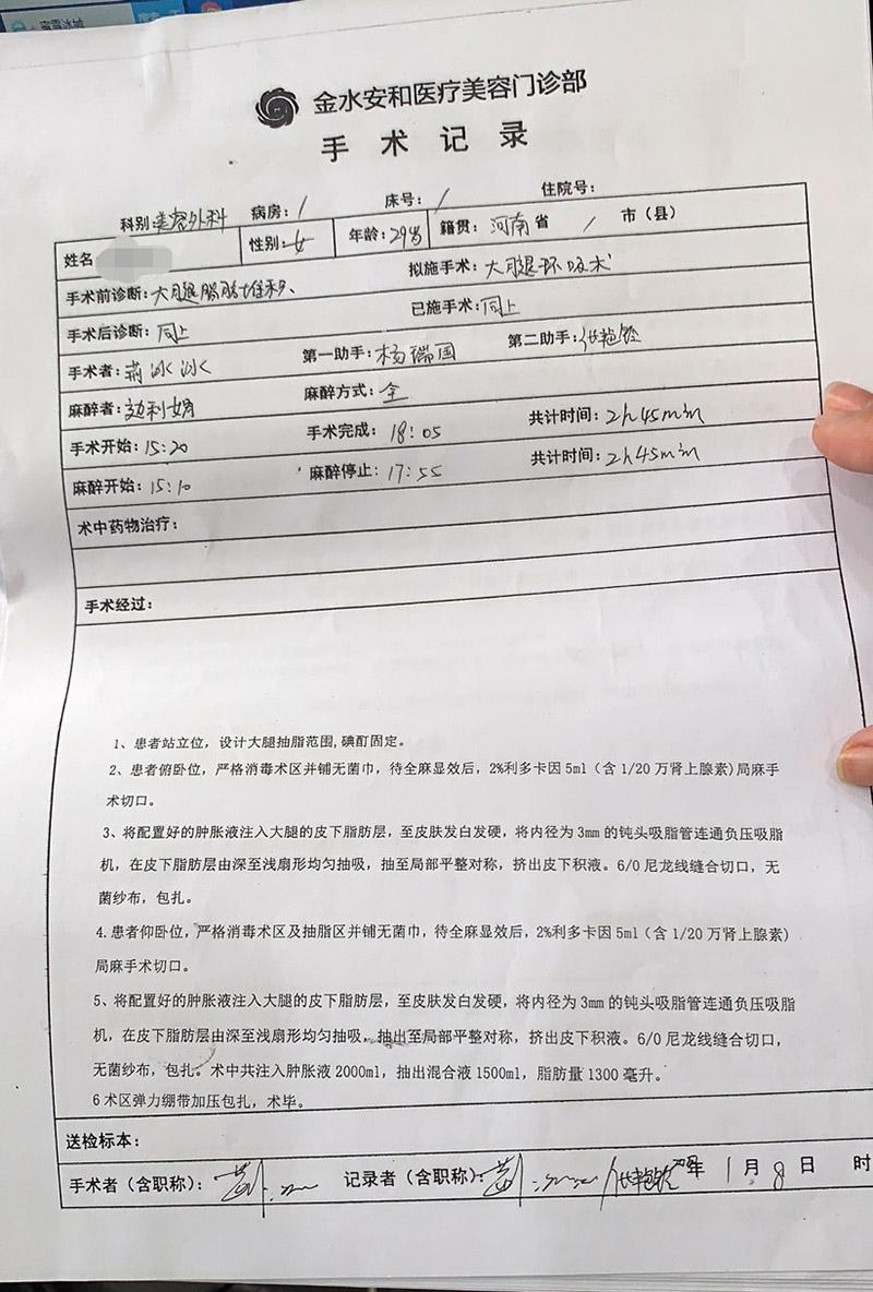 10月26日,小梦向猛犸新闻·东方今报记者讲述经历:2020年1月8日,她花费2万元在郑州市安和医疗美容门诊有限公司(下称“安和整形”)做了大腿抽脂手术,3月份左腿局部开始出现积液,后来鼓起乒乓球大的包,4月26日返回安和整形调节24天不见好转。