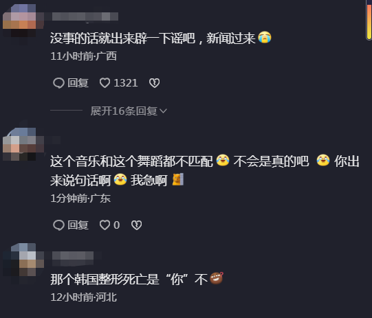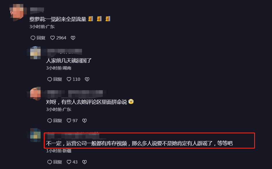 在这件事引起热度之后,蔡萝莉的评论区一夜之间就沦陷了,其中大部分都是问她是否健在的消息。但蔡萝莉一条都没有回复过,甚至表示她之前都是日更,但现在已经有4天没有更新了,甚至她后一条视频中的BGM,是网红庄慕卿身亡前用的。