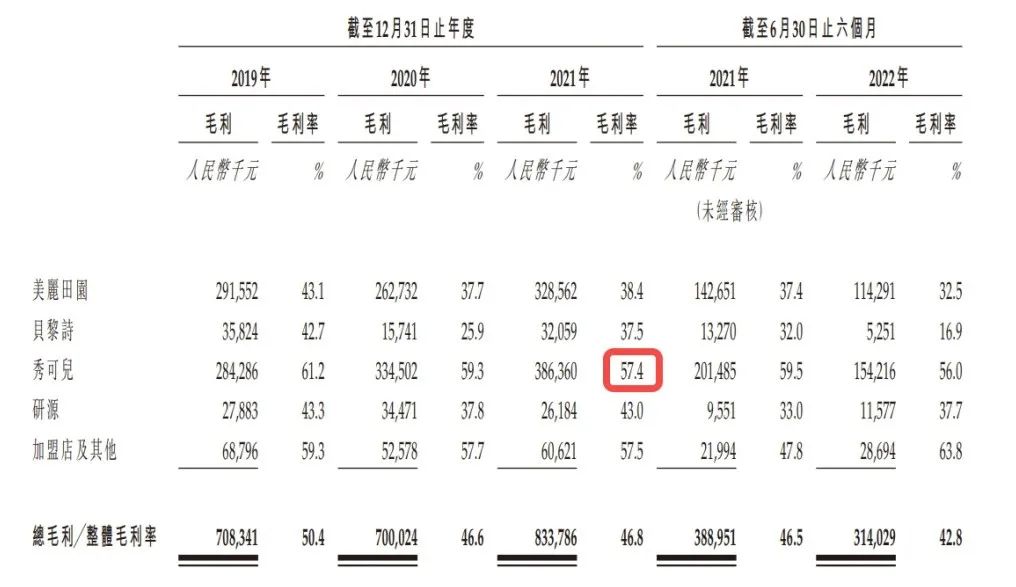 相比之下,医美业务的盈利能力显然更为坚挺。同期,秀可儿的毛利率分别为61.2%、59.3%、57.4%和56%;2022年上半年毛利率较2021年仅下降1.4%。