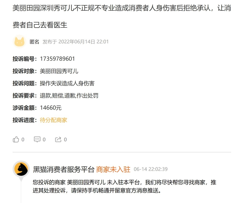在黑猫投诉上,一位消费者于2022年6月发起的投诉,涉及在秀可儿门店注射导致眼部视力问题的事故,至今还未处理。