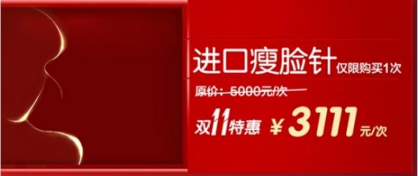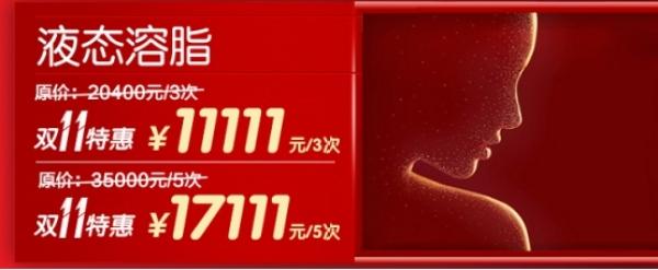 液态溶脂(-面颊或双下巴)原价:20400元/3次,双十一特惠:11111元/3次;原价:35000元/5次,双十一特惠:17111元/5次,同样推荐想减掉面部和下巴肥肉的姐妹在双十一的时候安排。