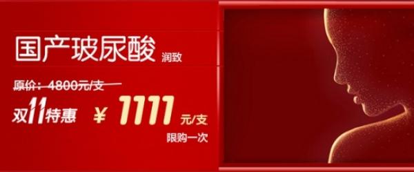 国产玻尿酸(润致)原价:4800元/支 双十一特惠:1111元/支(限购一次)。玻尿酸属于我的常年回购清单之一,双十一当然要好好囤一波!