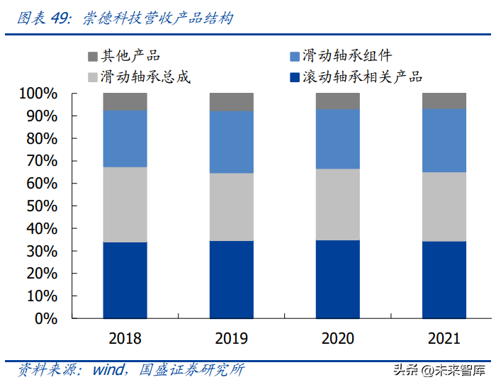 滑动轴承产品优势突出,聚焦国内中高端市场。从产品结构来看,滑动轴承总成、滑动 轴承组件、滚动轴承相关产品为公司主要产品,2021 年收入占比分别为 30.81%、28.2%、 34.46%,未来随着产能扩张,滑动轴承产品占比有望进一步提高。从地区结构看,公司 目前仍以国内市场为主,在中高市场占据重要份额。同时公司凭借自身齐全的产品型谱 及,产品销往韩国、印度、德国、美国、法国等多个和地区,近年来公司外销占比 略有上升。2021 年公司国内、海外收入占比分别为 92.5%、7.5%。