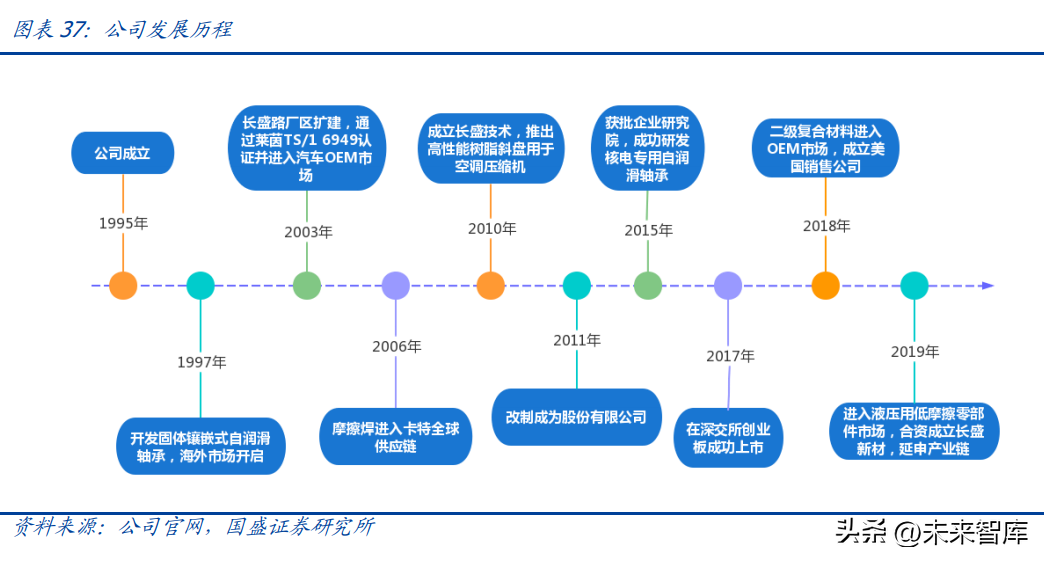 专注自润滑轴承,造就国产龙头。浙江长盛滑动轴承股份有限公司始创于 1995 年 6 月, 1997 年通过固体镶嵌式自润滑轴承打开海外市场,2003 年进入汽车 OEM 市场,2006 年进入卡应链,2015 年成功研发出核电专用自润滑轴承。2017 年上市以来, 公司不断加强产品竞争力,先后拓展二级复合材料、液压用低摩擦零部件等新产品,延 申产业链。目前,公司已成为专业从事自润滑轴承及高性能聚合物的研发、生产及销售 的高新技术企业,产品涵盖自润滑轴承、低摩擦副零部件及相关精密铸件,覆盖汽车、 工程机械、农业机械、建筑机械、轻工机械、高速高精数控机床、核电等下游应用,并 出口欧美、日本等 40 多个和地区。经过多年发展,公司已成长为具备竞争力的 自润滑轴承国产龙头。