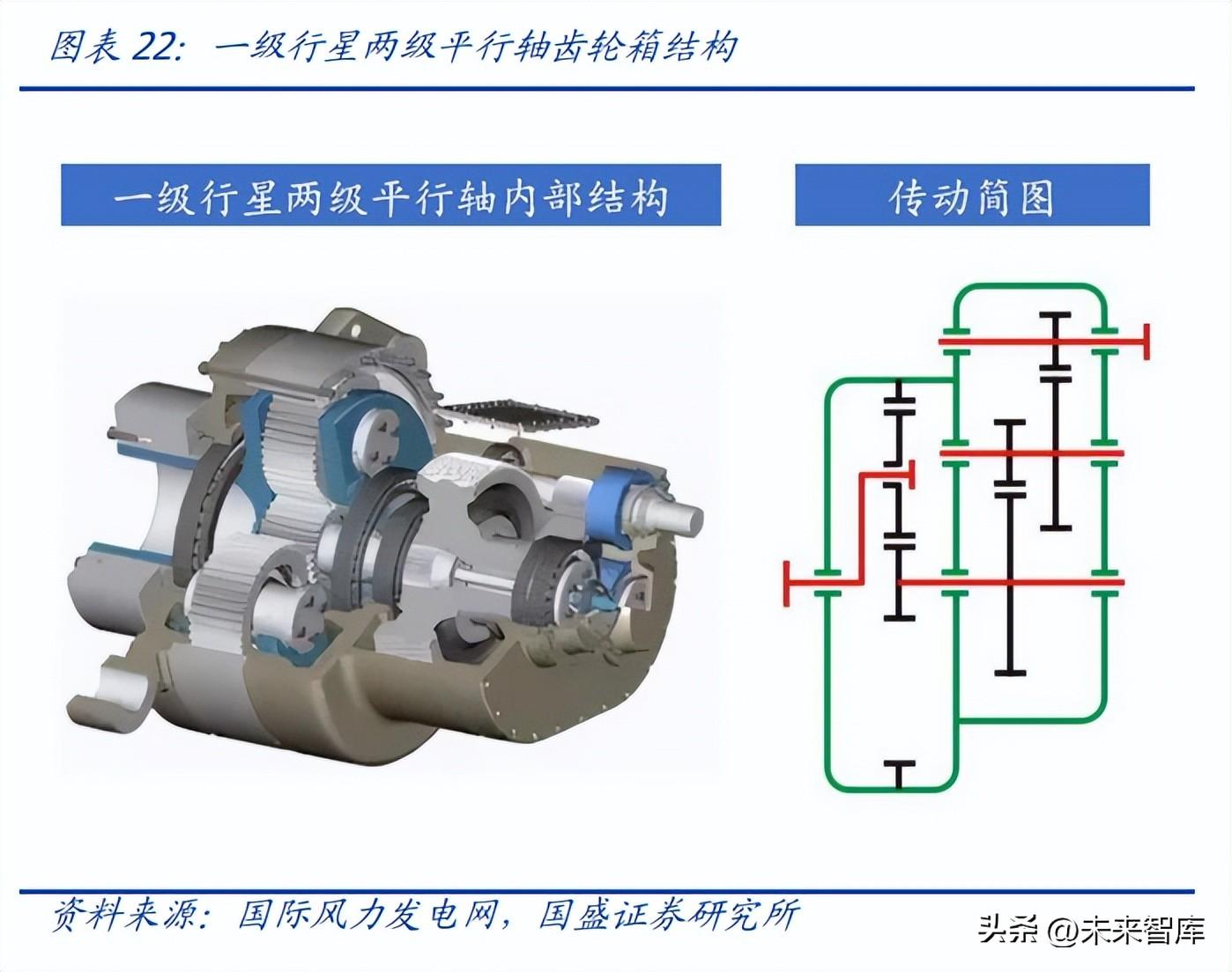 齿轮箱轴承:理论上中低速齿轮箱可全部替换为滑动轴承,高速齿轮箱中低速轴、中速 轴可替换为滑动轴承。在双馈机型和半直驱机型中,由于发电机的磁极对数较小,风电 叶轮转速远远达不到发电机的额定转速,因此必须通过齿轮箱增速来实现发电。不同机 型齿轮箱的工况与传动比要求不同,因此结构差异较大:1)双馈机型一般采用行星轮系 +平行轴传动的高速齿轮箱,目前应用广泛的为三级传动结构,主要为“一级行星+两 级平行轴”和“两级行星+一级平行轴”两种类型,一级行星两级平行轴多应用于 2MW 及 2MW 以下的风电机组,可靠性更高,但体积也相应更大;两级行星一级平行轴主要 用于 2.5MW 以上的风电机组,具有承载力强、变率高、体积小的优点。