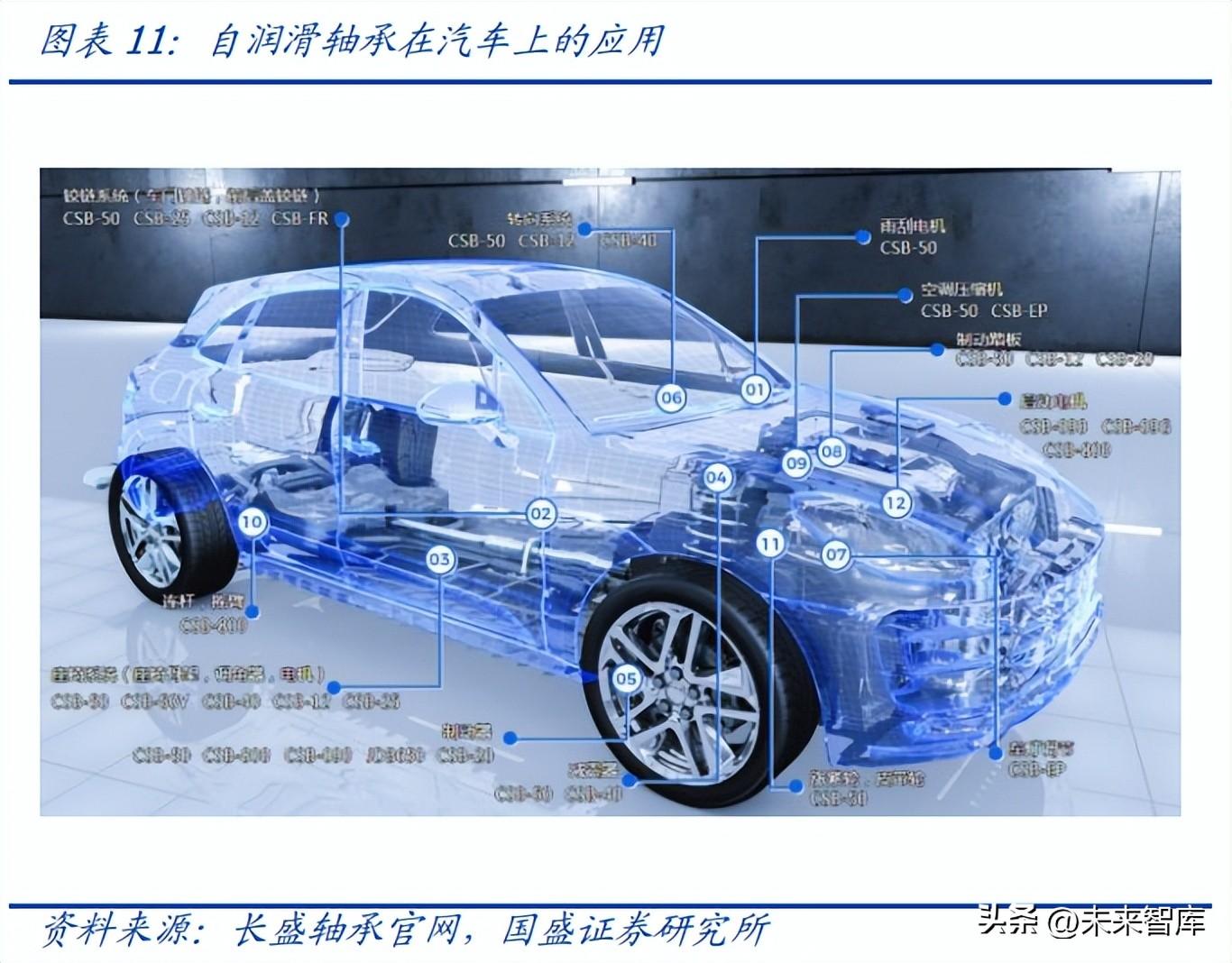 从应用领域来看,汽车自润滑轴承快速推广,产品与技术加速渗透。自润滑轴承备具轻 量化、低噪音、无给油、柔性等优点,因此其在汽车上的运用得以快速推广。自润滑轴 承及相关技术在汽车领域正在加速渗透:(1)目前每台乘用车上自润滑轴承的运用数量 已从之前的 30 件增加到 100 多件,而且正在不断地替代滚针、粉末类轴承而产生新的 运用;(2)除了轴承以外,自润滑技术在非轴承领域的运用也在增加,比如用于空调压 缩机的自润滑涂层斜盘、具备自润滑性能的高分子工程塑料结构件等。