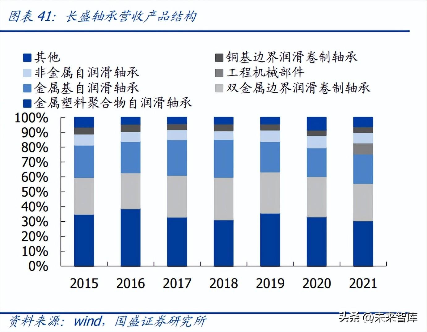 内外兼修,三大产品齐发力。从地区结构看,公司较早进入汽车 OEM 市场,并陆续进入 卡特彼勒、利勃海尔等工程机械整机厂的供应商体系,因此外销是公司重要收入来 源。近年来公司基于多年积累的行业优势,逐步增加国内市场份额,内销收入占比有所 提升。2021 年公司国内、海外收入占比分别为 55.0%、45.0%。从产品结构来看,金属 塑料聚合物自润滑卷制轴承、双金属边界润滑卷制轴承、金属基自润滑轴承为公司三大 优势产品,2021 年收入占比分别为 30.5%、25.2%、19.8%,合计占比 75.5%。