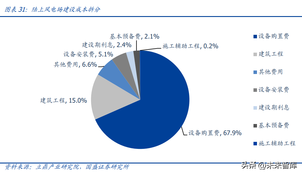 陆上风电设备购置费约占风电场建设成本的 67.9%。根据立鼎产业研究院对某 50MW 风电场的成本拆分数据,陆上风电场约 67.9%的成本来自于设备费;设备费中 94%的成 本来自于发电设备;发电设备中 80%来自风电机组成本,17%来自塔筒成本,因此风电 机组费用及塔筒费用是陆上风电场建设的主要成本。
