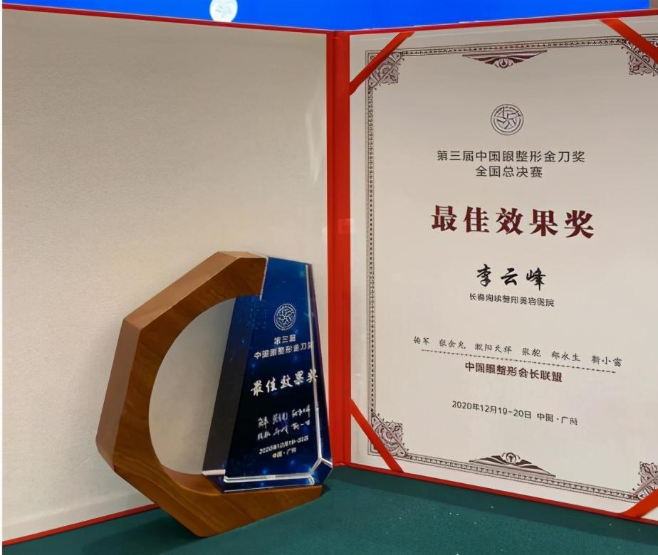 中国眼整形金刀奖擂台赛是中国眼整形行业重量级的专业技能比赛,被誉为中国眼整形高竞技舞台,也是具有代表性、专业性、性及影响力的眼整形手术技术擂台大赛,更是国内整形医生检验自我技术的平台之一,被称为眼整形奥斯卡。金刀赛每年都有3000多名眼整形医生报名参赛,经层层严格的筛选和比拼,终能够获奖的医生,无论技术还是审美都是国内眼整形领域的实力派。海峡李云峰院长作为吉林省金刀奖佳效果奖得主,可见其眼整形技术实力之深厚。