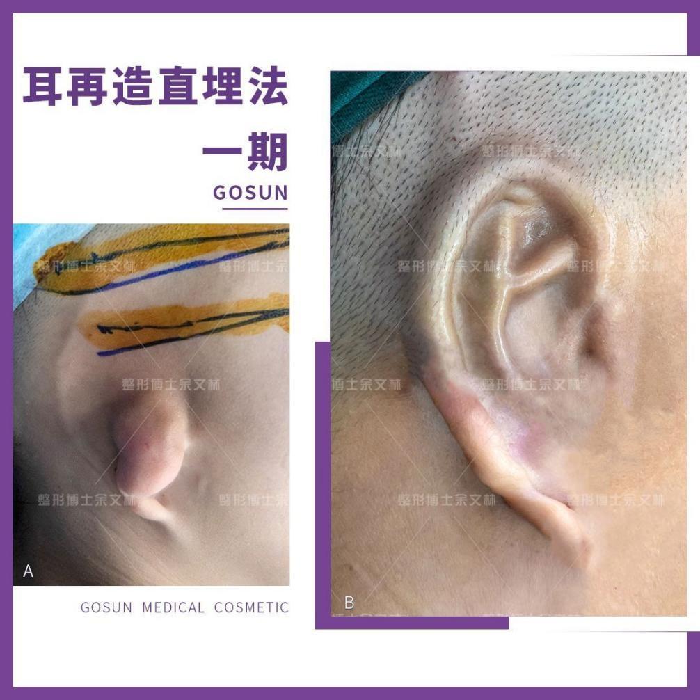 【手术效果】:一期手术后,重塑的耳廓结构,形态良好,不过软骨支架需要3-6个月与耳部组织长牢固,且耳朵处于贴着头皮的状态,半年后再进行二期立耳手术,让耳朵舒展开来。