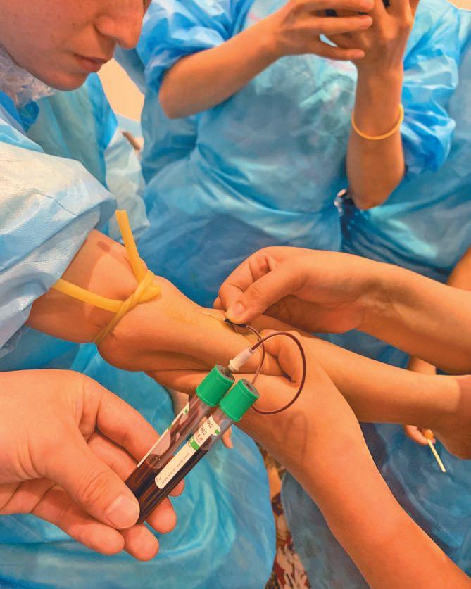 课程紧凑,第二天,老师又带学员练习输液、抽血。这比注射更难,一节课下来,有学员扎对方五六针才找到血管,有的手背鼓包青紫,也有学员忘记消毒、止血。