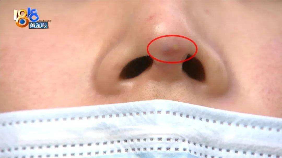 从平视角度看过去,小熊姑娘的鼻子没有异常,但是从下往上看,问题就来了,鼻尖下方有一处红肿,上面有一个淡黄色的小凸起和一个小孔。小熊说,这个小凸起很可能成为线头第二次穿出来的位置