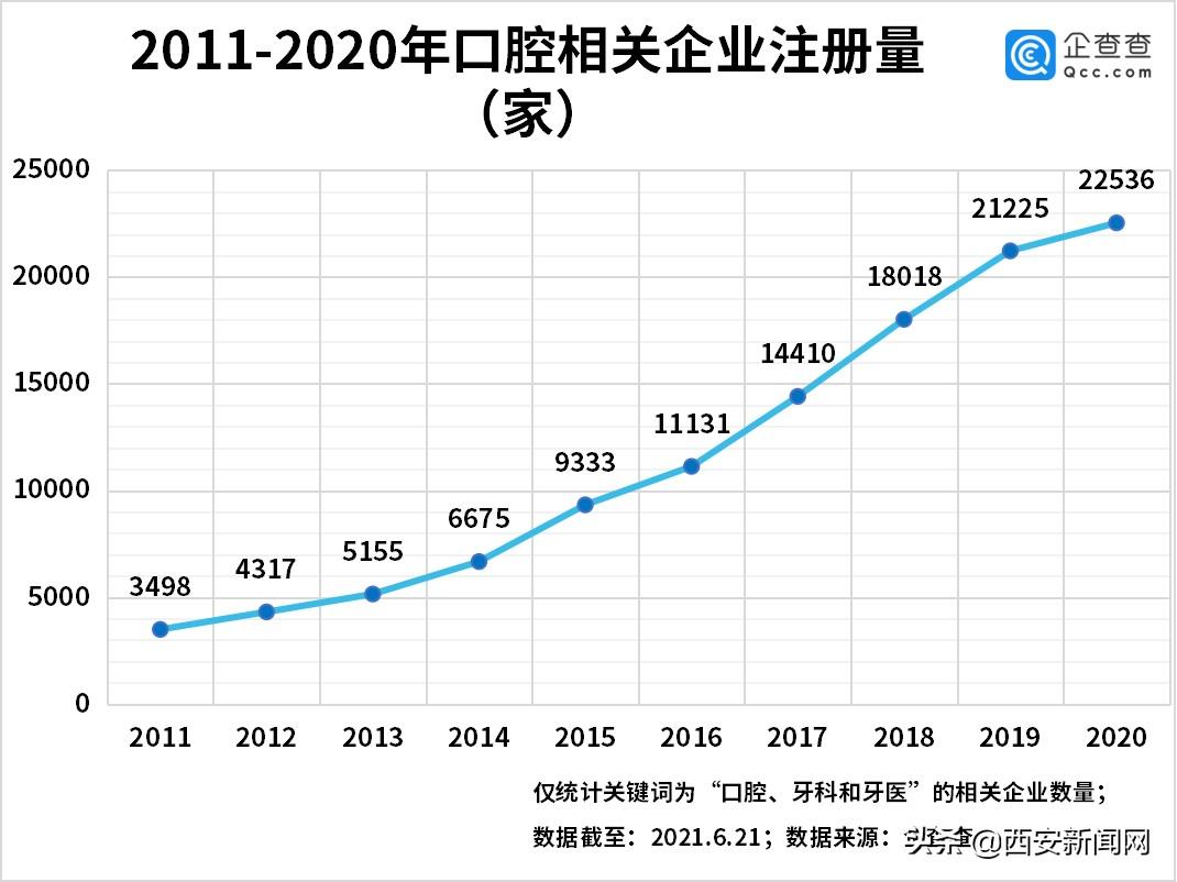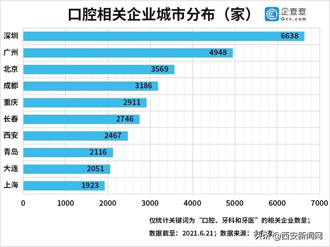 6月23日,企查查发布数据显示,我国共有关键词为“口腔”、“牙科”和“牙医”的现存企业14.37万家(以下简称口腔相关企业),其中西安市坐拥2467家相关企业位列全国第七。