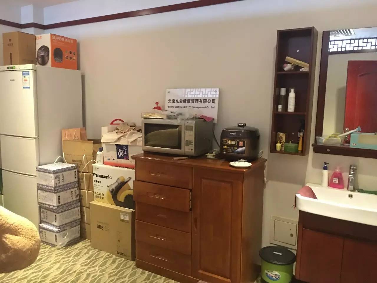 北青报记者打量几间“诊疗室”发现,其中一个房间的微波炉上放着一块疑为门头标牌的白色底面的牌子,上面写着:北京东云健康管理有限公司。另一间“诊疗室”里,则坐着一位说韩语的中年男性,萧医生解释,“这是韩国请来的医学教授。”