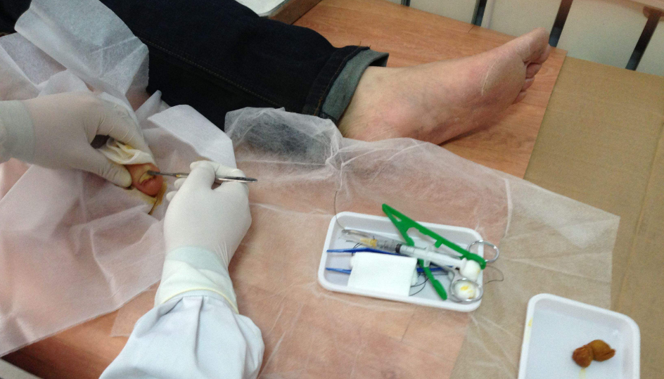 先用直剪在预先确定的范围将趾甲剪开至趾甲根部,再用直血管钳将趾甲钳紧,用力拔出,拔除嵌入甲沟周围组织的趾甲,其余部分保留,剪除坏死组织和肉芽组织,清除碎甲,用双氧水搓洗,生理盐水清洗干净创面,用0.3%碘伏填塞修剪部位,再外敷0.3%碘伏湿纱块。