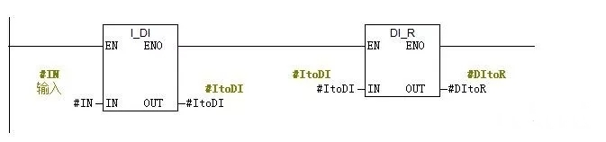 PLC在处理模拟量时,其输入和输出大多是整数,用浮点数来处理这些数据时要进行整数和浮点数之间的相互转换。例如图6所示,现场采集的数据为16位的整型数("#IN"),PLC在做控制前,要先将其转换为浮点数("#DItoR")。由于整型数占16位,而浮点数占32位,二者不能直接转换。要先将整型数转换为双整型("#ItoDI"),然后再转换为浮点型。